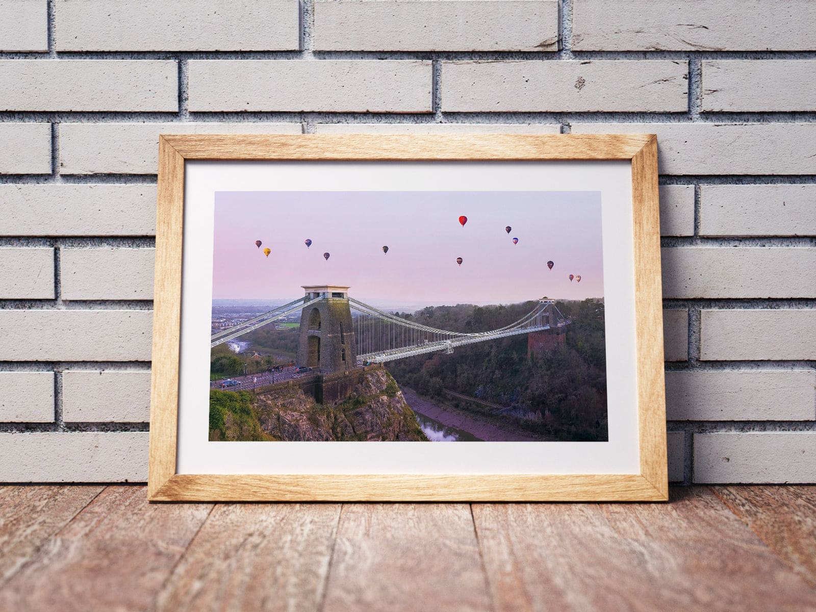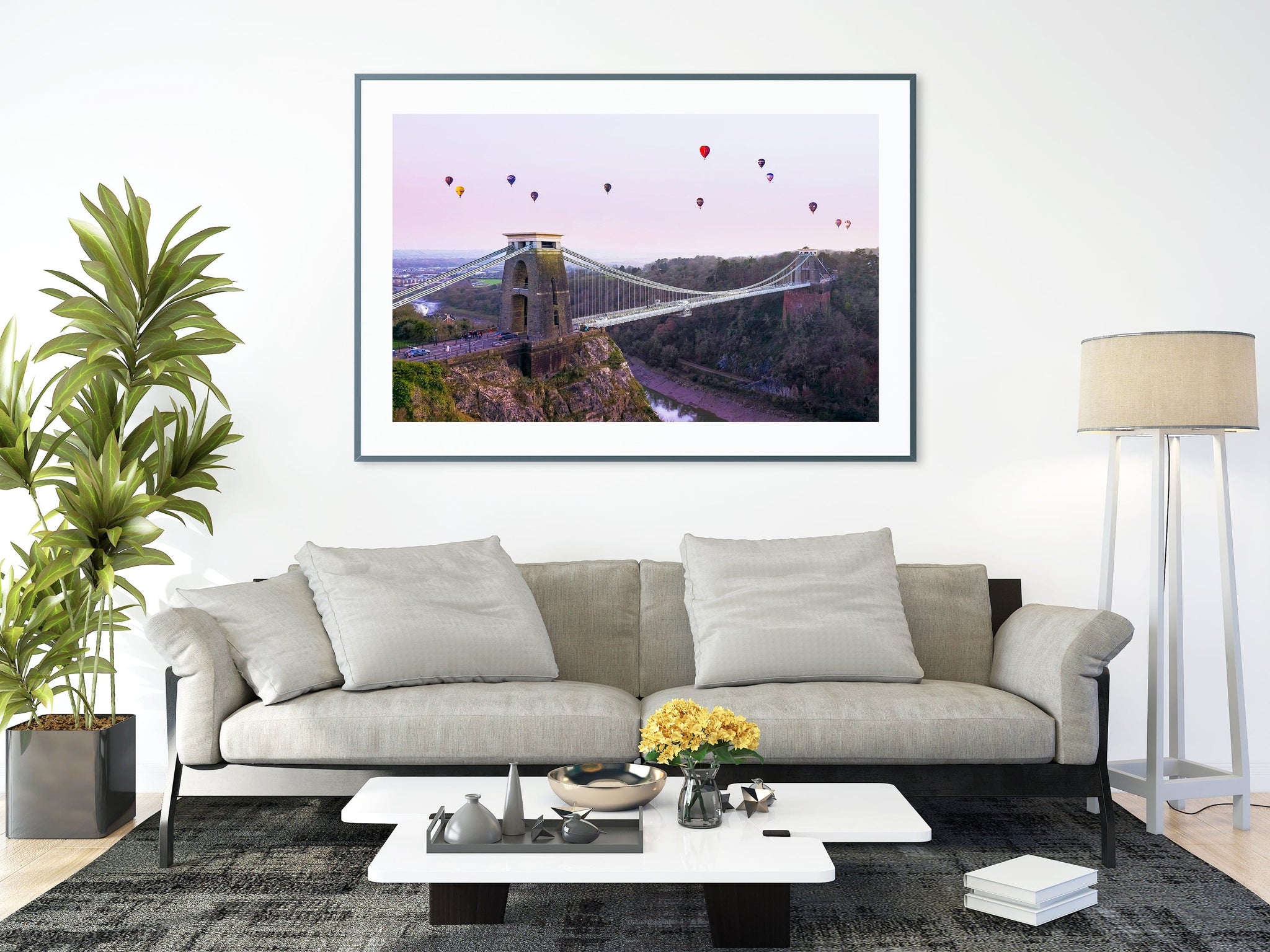 One of our photographic prints of The Clifton suspension bridge during sunset with a group of Hot Air Balloons above from the Bristol Balloon Festival.