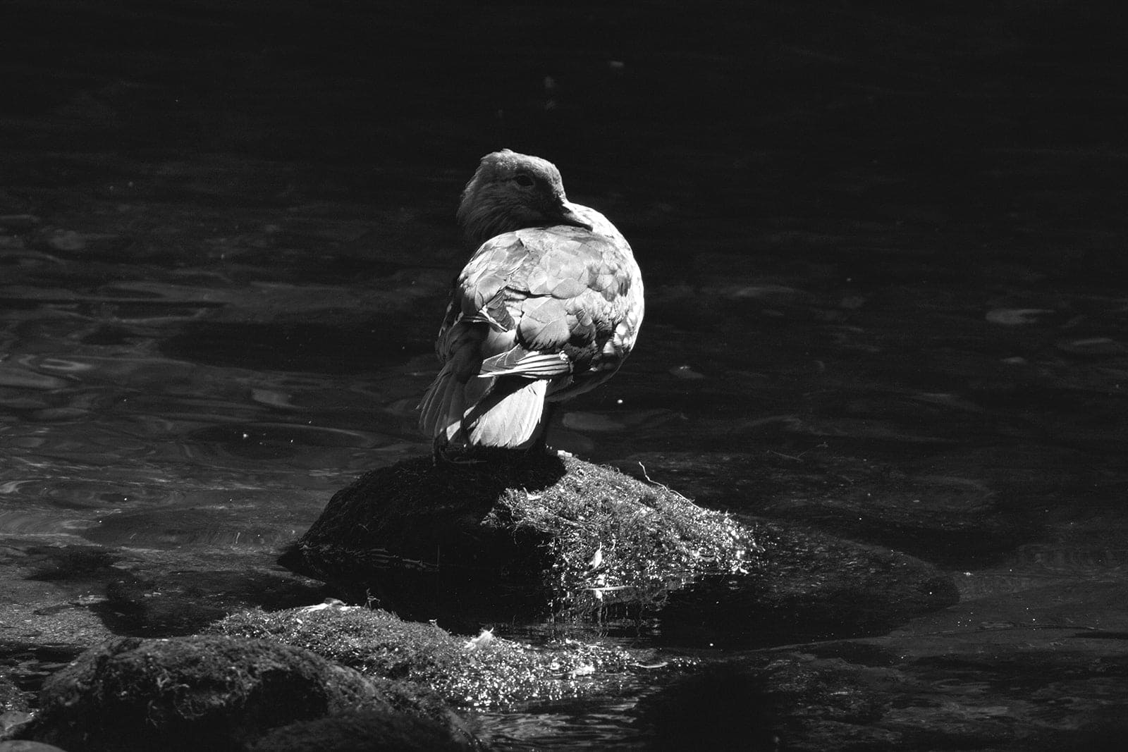 A fine art black and white image of a Duck sat in the morning light on Devon's River Dart