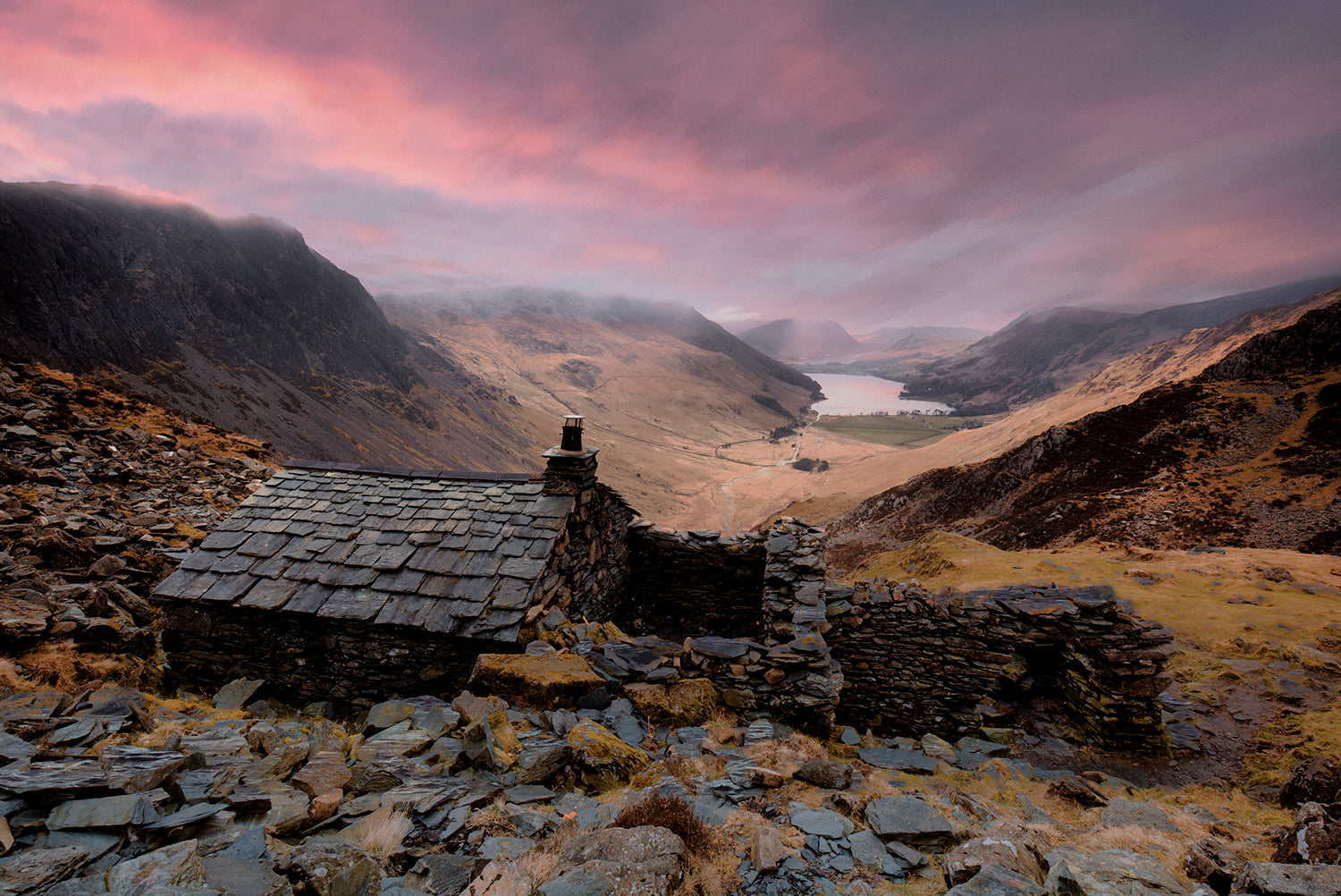 One of our photographic Buttermere Bothy Prints: showing the Warnscale Bothy during a dramatic sunset at Englands lake district.