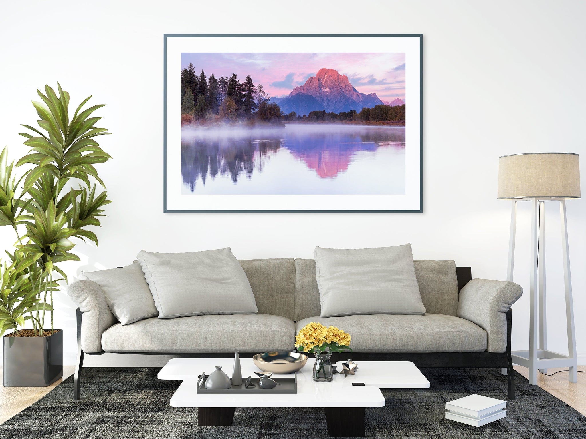 One of our photographic American prints of Oxbow Bend for Sale: The Dramatic Mt Moran sits behind the iconic Snakes River in the Grand Teton State Park.