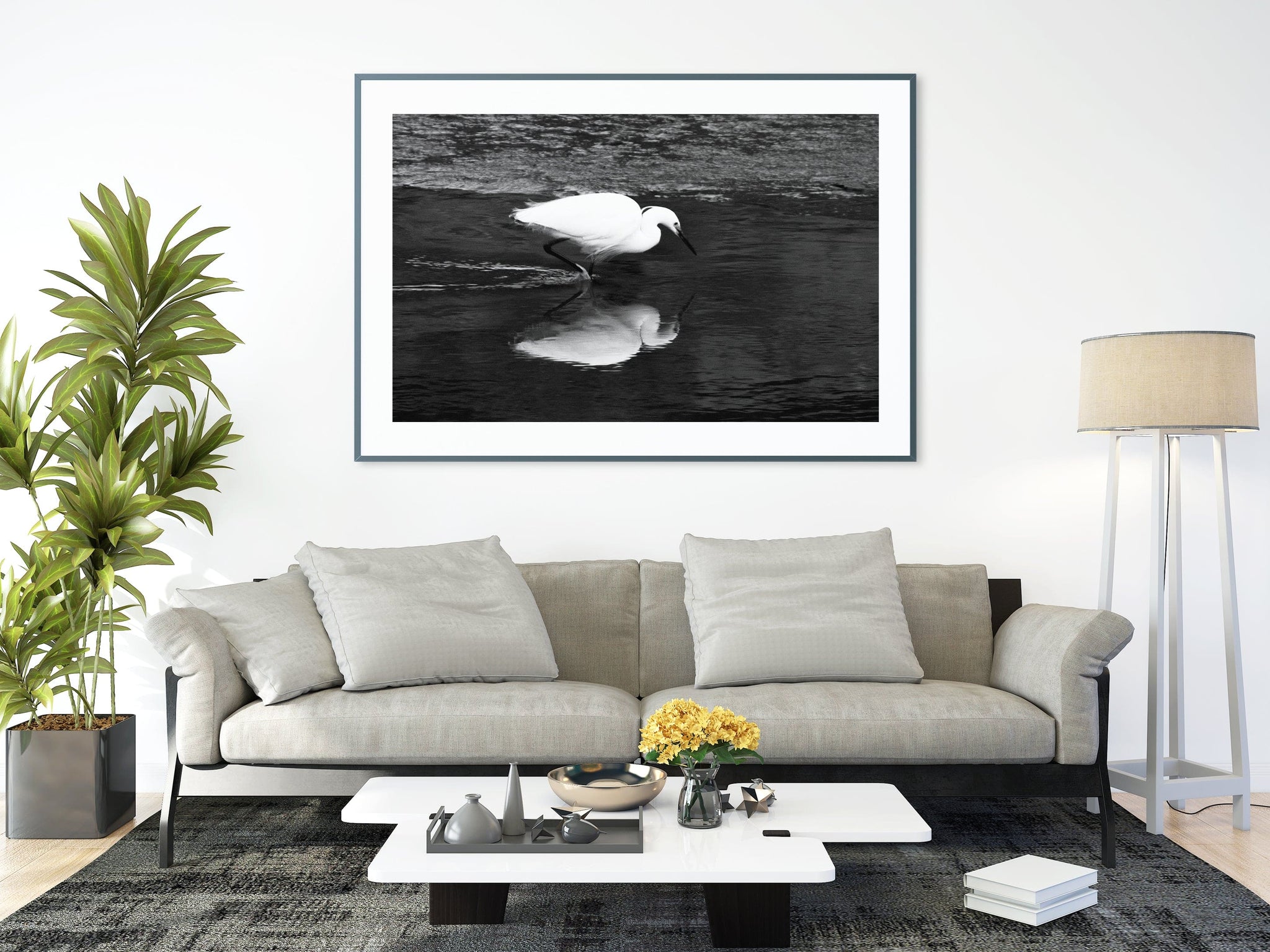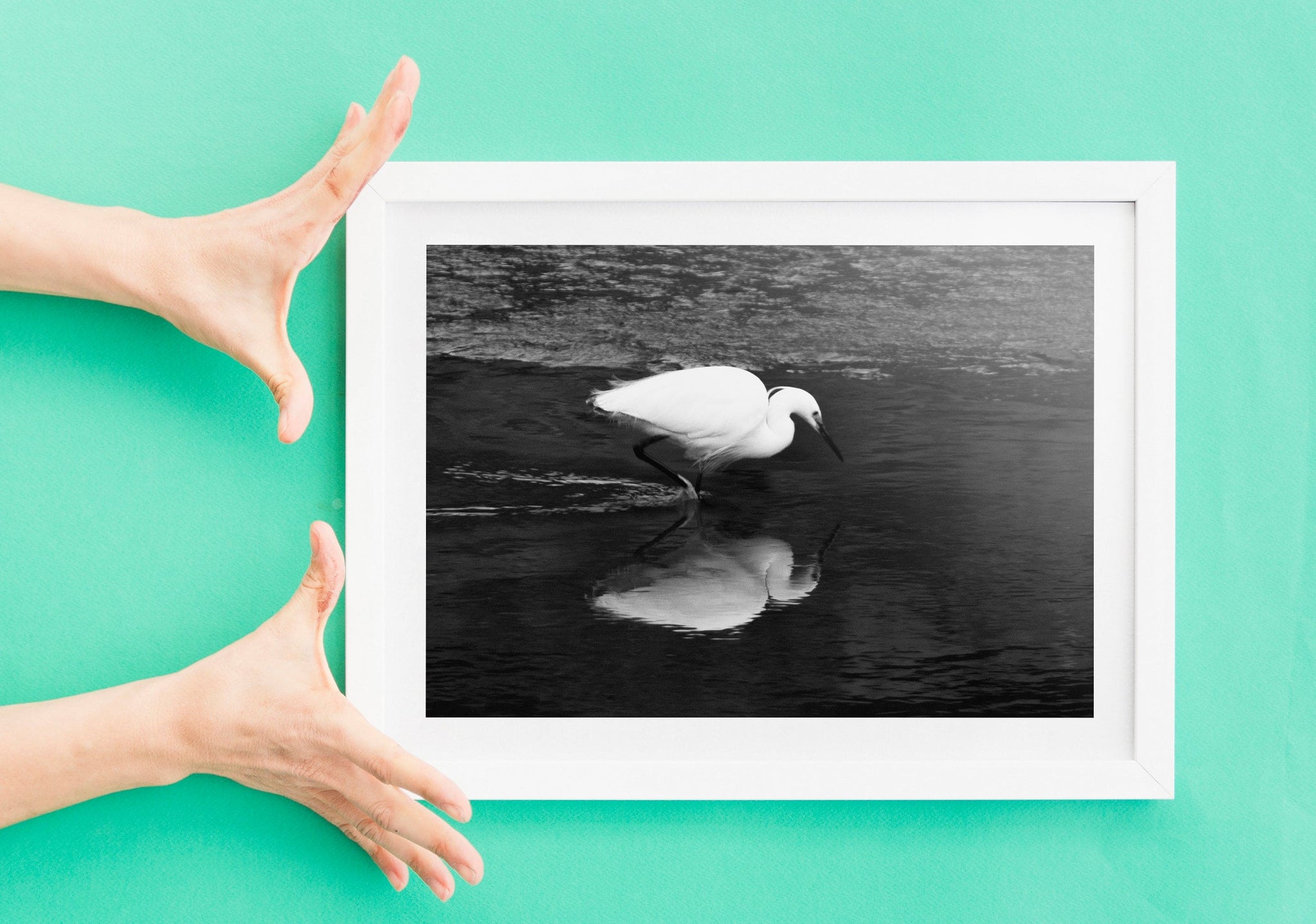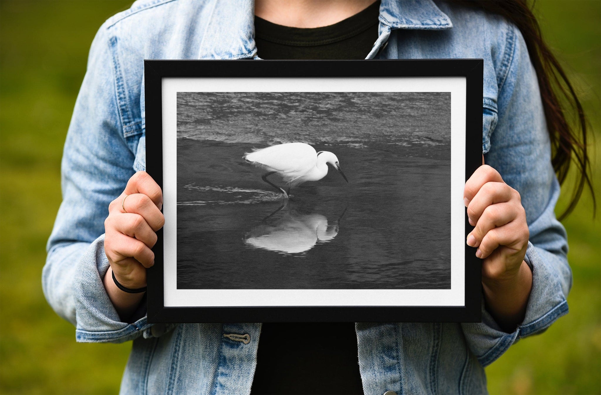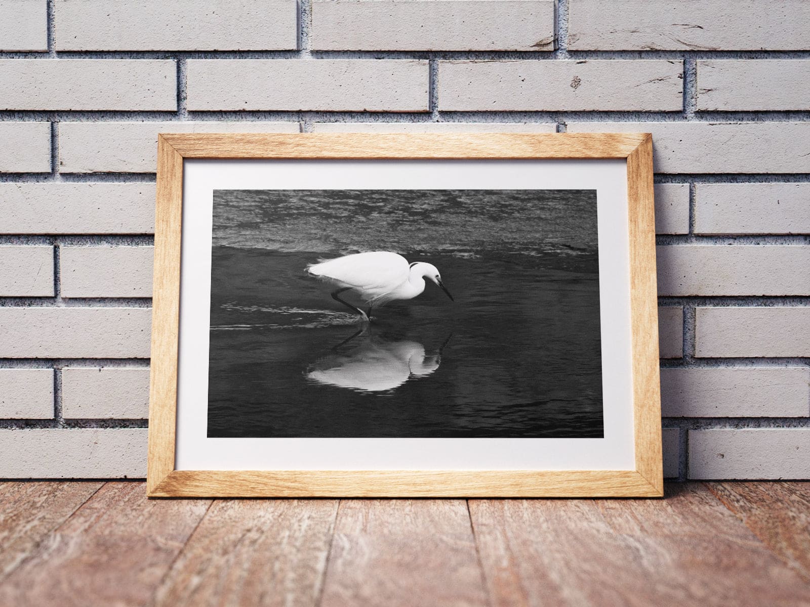 One of our Wildlife prints: A Black and White wall art print of a White Little Egret on the water in South Devon.