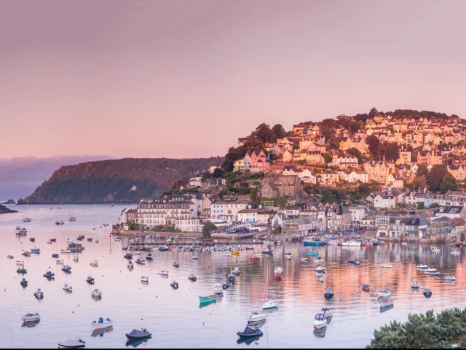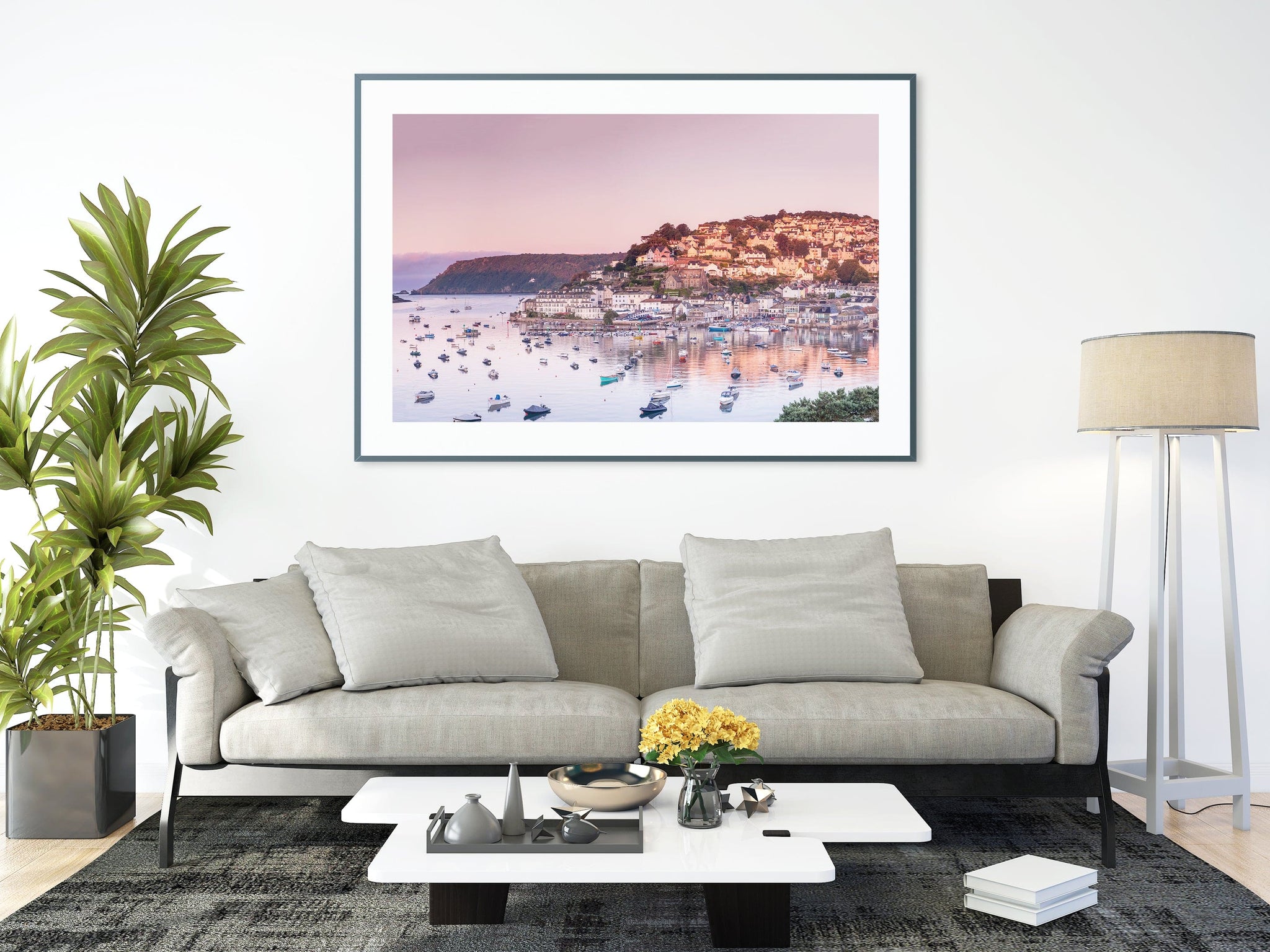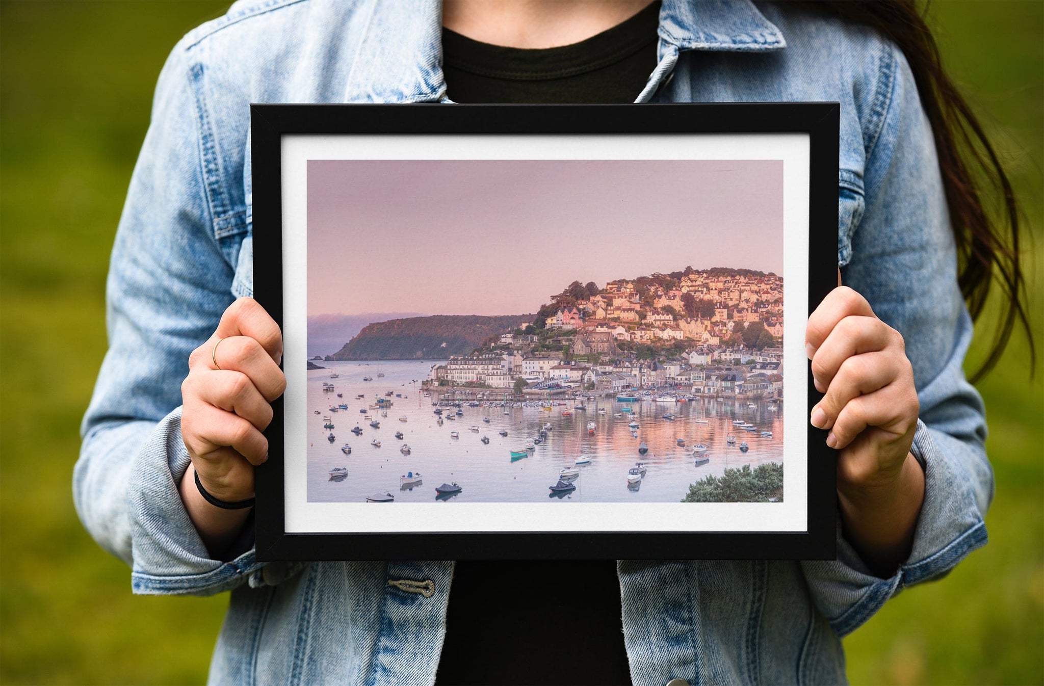 One of our photographic prints of South Devons Salcombe Town: A sunrise shot over looking the picturesque town of Salcombe in the South Hams Region of Devon. Taken during a vibrant sunrise with the golden light illuminating the town and the boats of Salcombe Harbour and the Kingsbridge Estuary.